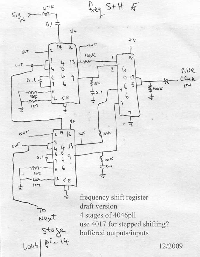 The Analog Shift Register is well known, where voltages are shifted over three stages. This is the same in concept except it shifts frequencies and uses 4046 PLLs to do it.